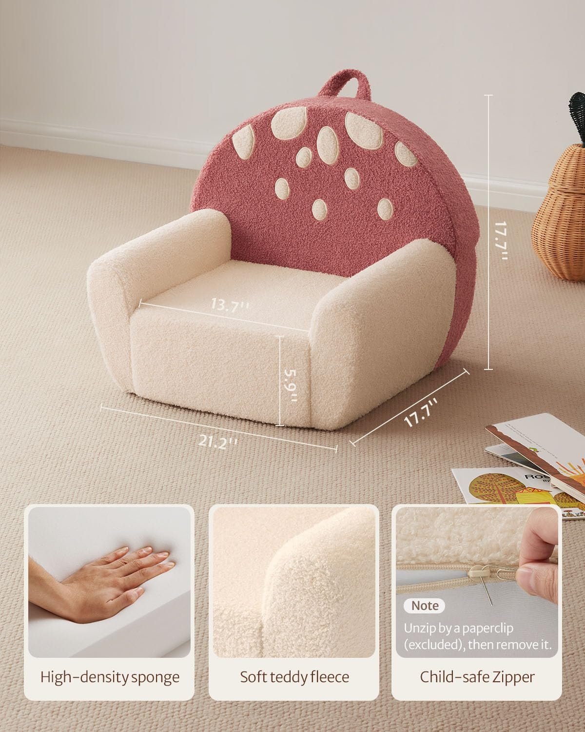 The Blissful Diary Mushroom Armchair is a cozy and stylish seating solution designed for kids, featuring a soft teddy‑fleece cover and supportive foam structure. Its removable, machine‑washable slipcover makes cleaning easy, while the charming mushroom design adds a playful touch to any room. Perfect for reading, relaxing, or playtime-bring comfort and fun to your child’s space today.
