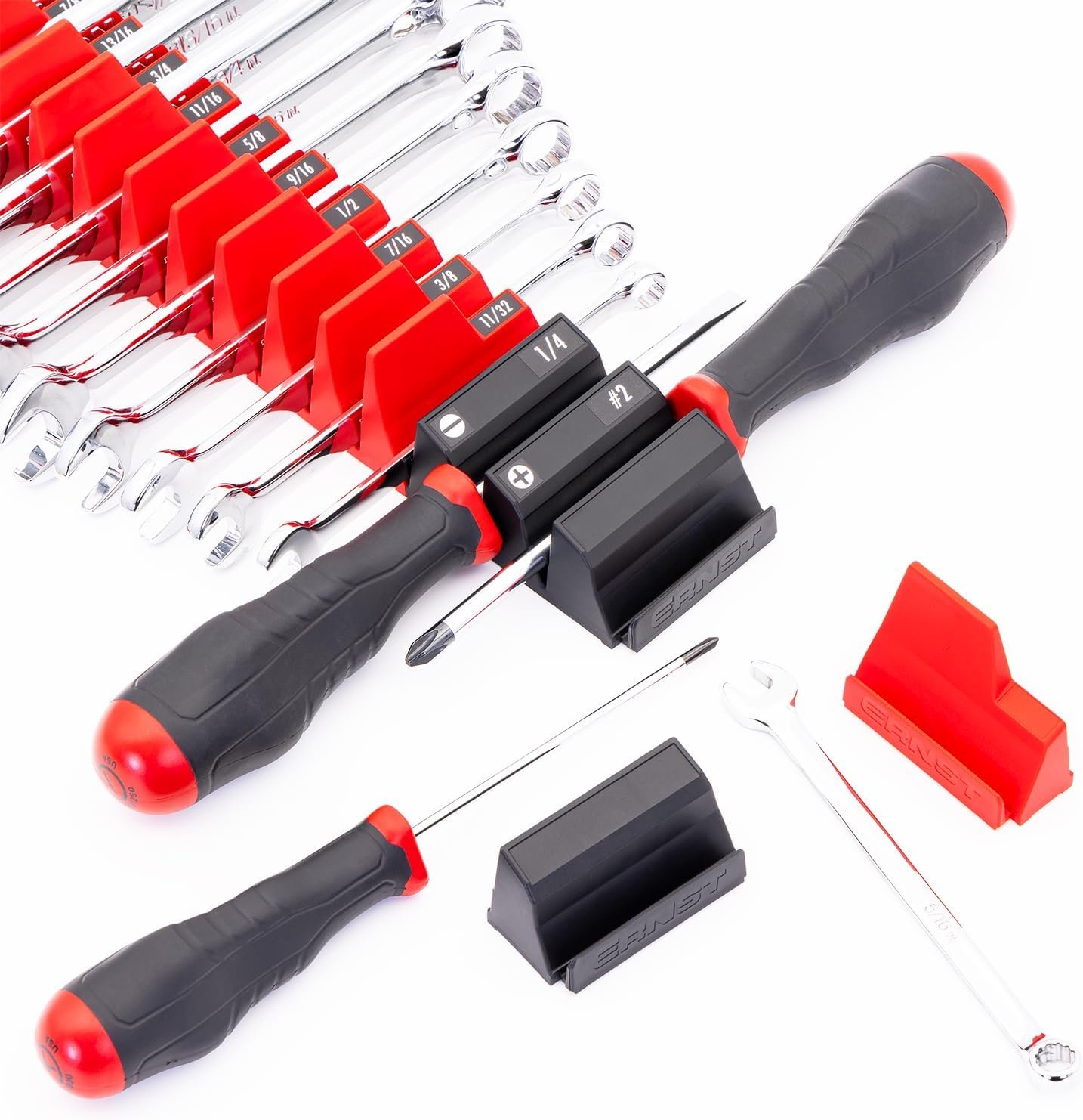 The Ernst 5413M Magnetic Wrench Organizer is a compact, modular storage solution that holds up to 40 wrenches upright while saving valuable drawer space. Its powerful magnetic base ensures tools stay in place through movements or liner surfaces. With labeled slots and broad size compatibility, this organizer brings order and efficiency to any workspace-check it out today.