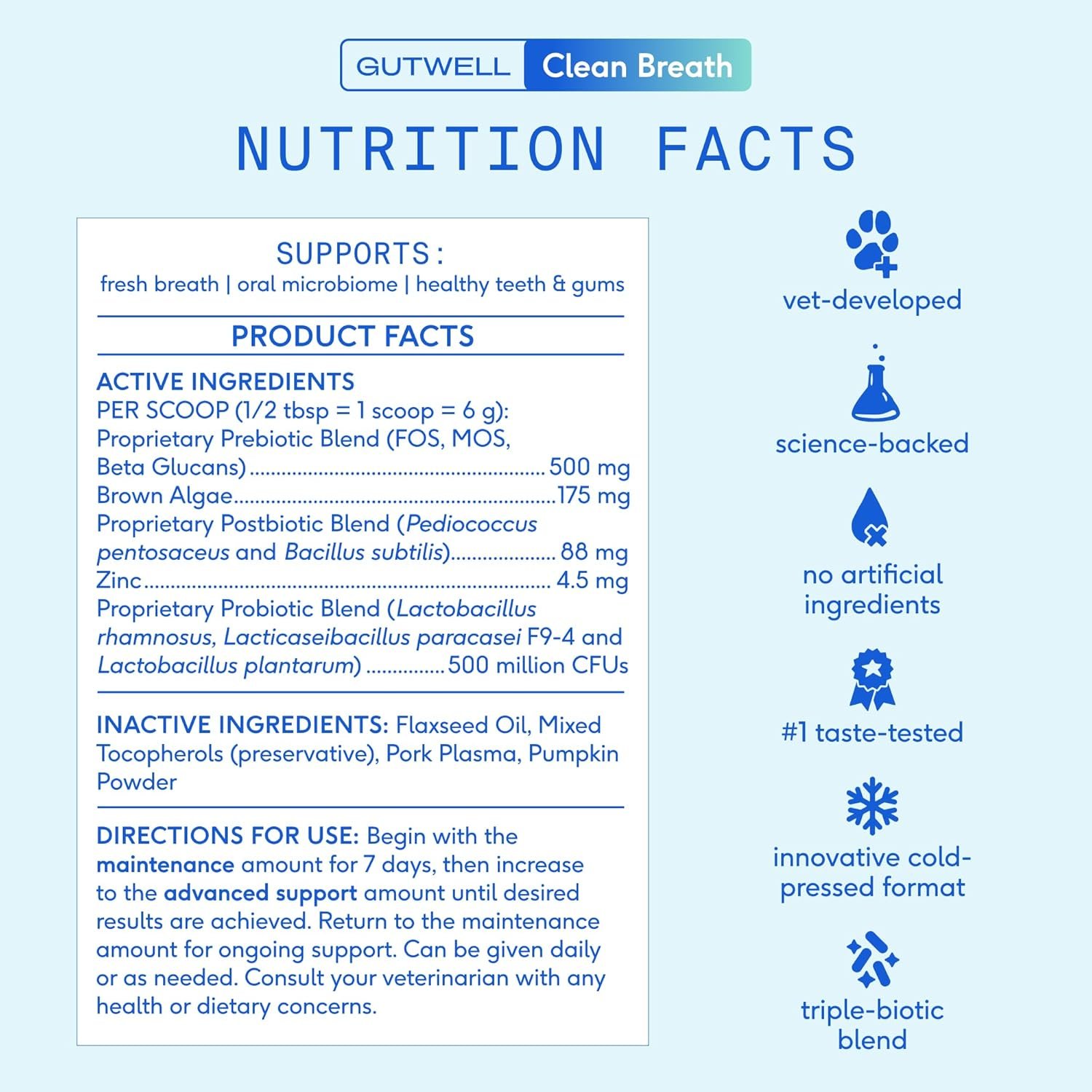 Native Pet GutWell Clean Breath is a veterinarian-formulated dental supplement designed to target bad dog breath at its source. It balances your dog’s oral and gut microbiomes with a triple-biotic blend of prebiotics, probiotics, and postbiotics, helping reduce plaque, tartar, and odor-causing compounds. Made with clean, whole-food ingredients and free from fillers or artificial additives, it promotes healthier gums and fresher breath, with noticeable results in as little as seven days.