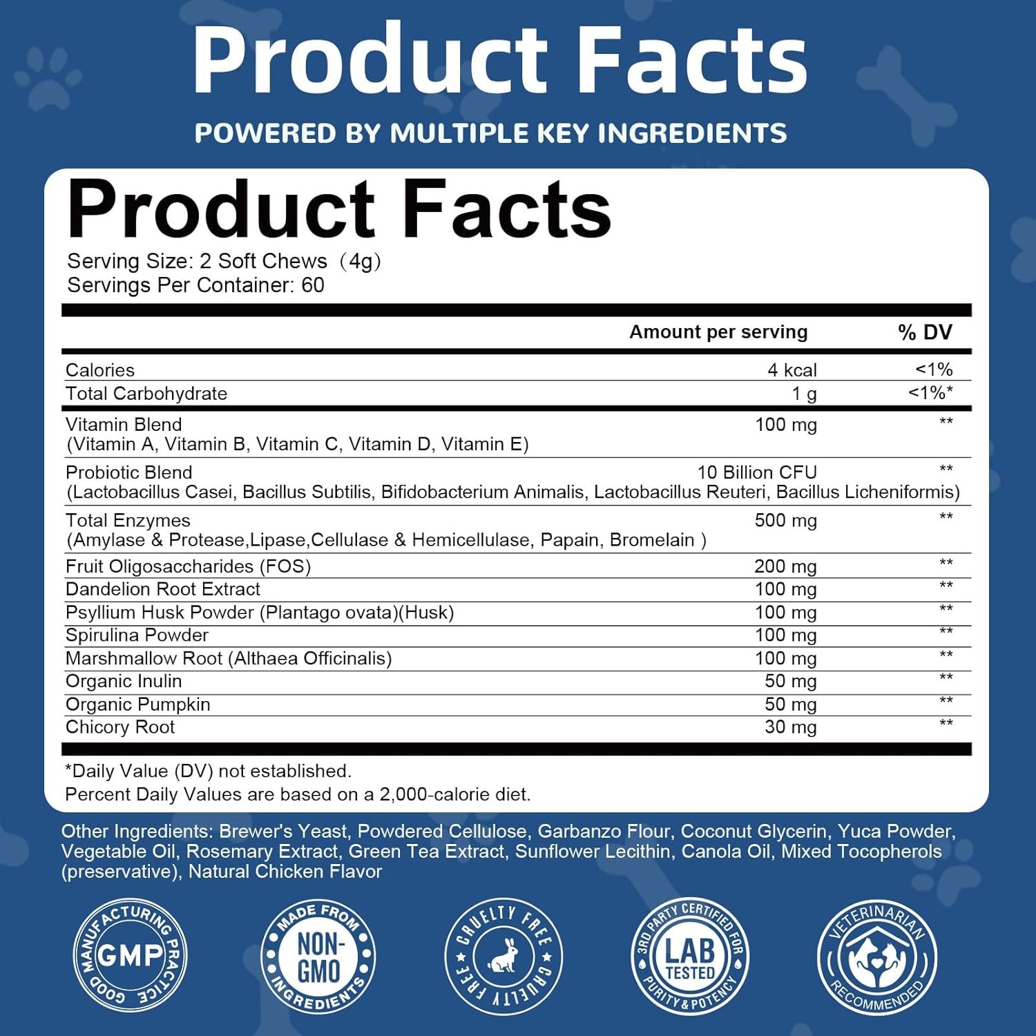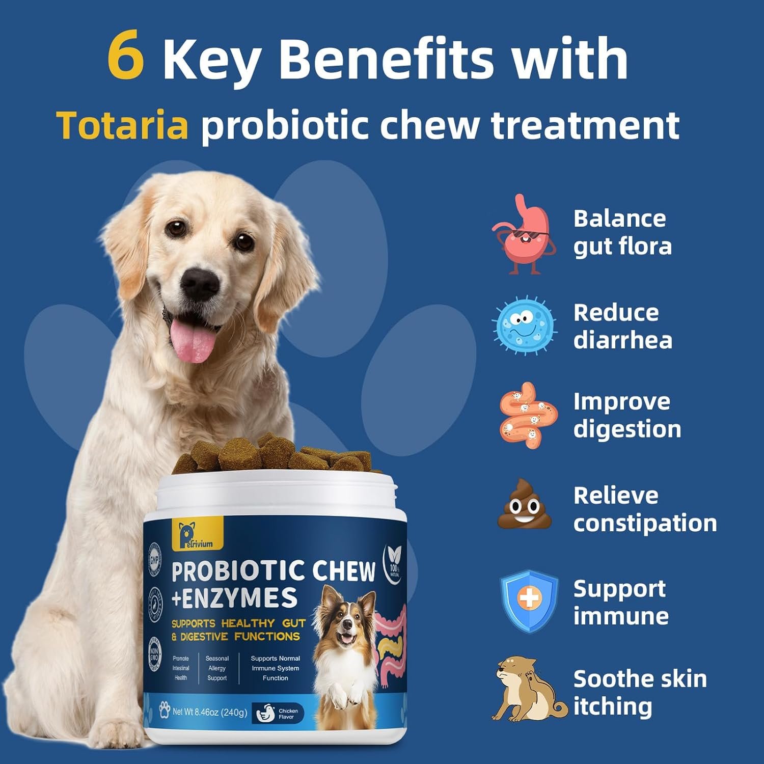 Petrivium’s Probiotics for Dogs is a natural, chewable supplement combining 10 billion CFUs, digestive enzymes, and fiber to support gut health, relieve digestive upset, and boost immune function. It includes multi-strain probiotics like Lactobacillus and Bifidobacterium along with prebiotic fiber (inulin/Chicory Root) to balance flora and reduce symptoms such as gas, diarrhea, and constipation. Made with a chicken base and free from fillers or artificial additives, these chews are suitable for all dog sizes and ages, helping maintain your pet’s wellness from the inside out.
